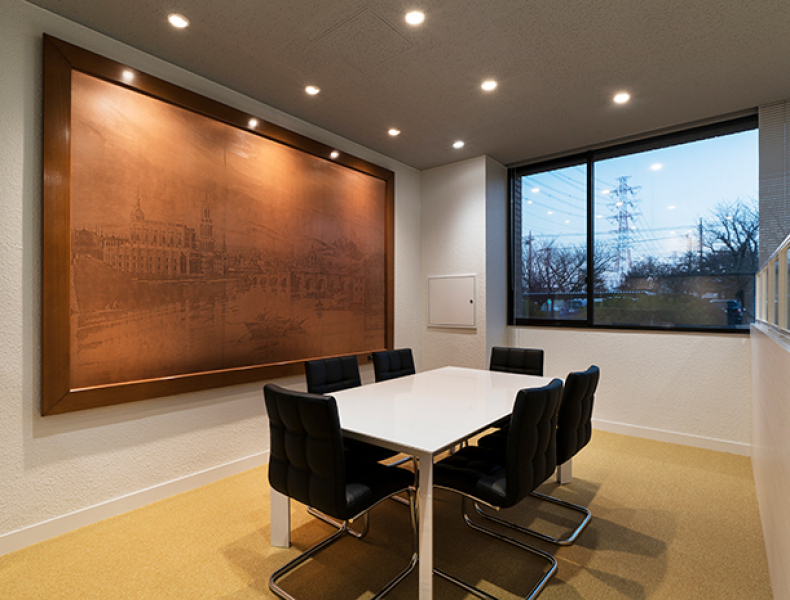 ロゴサインは銅箔のベースと鏡面仕上げのステンレスのサインで、非鉄金属業のリーデイングカンパニーである事を表現。銅箔部の英字ロゴと対になるようコーポレート・シンボルを使用する(R壁)ことにより、グローバル展開と日本のモノづくり企業である事を意識させています。