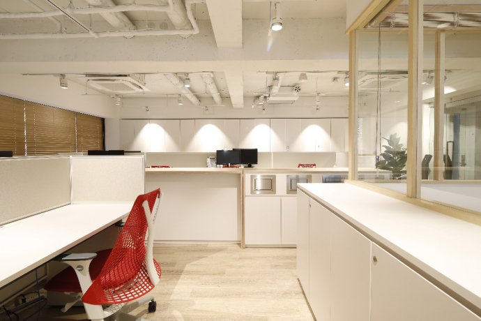 倉庫として使われていた3階建てのビルをリノベーションしました。余分なものを削ぎ落とした洗練された空間に、コーポレートカラーの「赤」をポイントカラーとして採用したミーティングルーム。来客時にも使用するスペースなので、会社の先進的な技術をイメージしたデザインにしました。