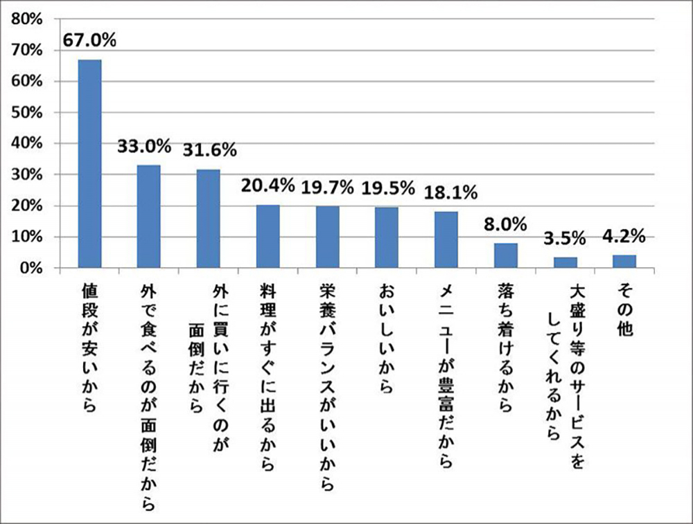 (3)・(4)のアンケートからわかるのは、社員食堂が「従業員からの需要も高く、満足度も最高を示した」ということです。社員食堂を利用する理由について訊いたところ「値段が安いから」(67.0%)が最も多く、次いで「外で食べるのが面倒だから」(33.0%)、「外に買いに行くのが面倒だから」(31.6%)、「料理がすぐに出るから」(20.4%)となりました。