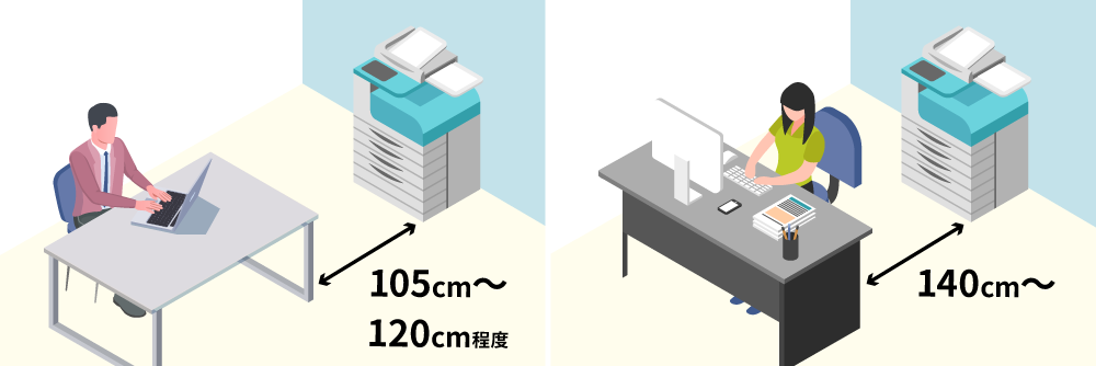 デスクとコピー機の配置には、サイドに設置するパターン(上図/左)と背後に設置するパターン(上図/右)の2つの選択肢があります。サイドに設置する場合、通路幅を105〜120cm確保すれば、作業スペースを考慮した上で十分です(※5)。一方、背後にコピー機を設置する場合は、作業スペース、着座時のスペース、そして通行人の往来を考慮して140cm以上の通路幅が理想的です(※6)。