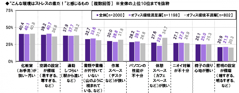 さらに「こんな環境はストレスの素だ!」と感じるものについて複数回答形式で訊いたところ、ワースト10はこのようになりました。