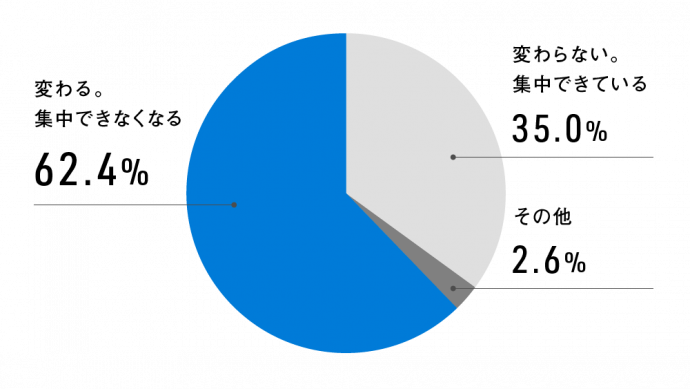 「社内会議中に隣の部屋や自室の会話漏れが気になる」と回答した人を対象に、会議への集中力が変わるかについて訊いたところ、「変わる。集中できなくなる」と回答した人が6割以上いることが判明しました。これはご自身の身に置き換えてみればよく分かりますが、実際に会話漏れしているかどうかに関わらず、「部屋の外に声が漏れているかもしれない」と思った時点で、集中力が散漫になってしまうものです。
