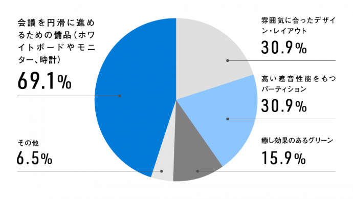 社内会議を行っている職場を対象に「社内会議で使用する場所に必要な要素」について尋ねたところ、「高い遮音性能をもつパーティション」と答えた人の回答率が同率2位となりました。 会議を行う上で「会議を円滑に進めるための備品」を揃えたり「雰囲気に合ったデザイン・レイアウト」を考えることも、もちろん大事です。