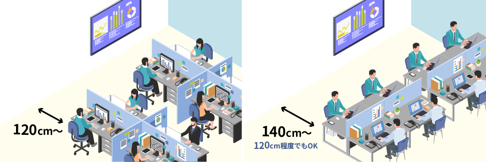 一般的に、島型レイアウトでデスクを配置する場合よりも、ブース型や背面型で設置した場合の方がデスクサイズが大きくなりがちです。ブース型は仕切りがあるため、あまり狭いと圧迫感を覚える原因になりますし、背面型にデスクを並べてチームブースを作る場合は、ある程度デスクの幅がないと窮屈になってしまいます。
