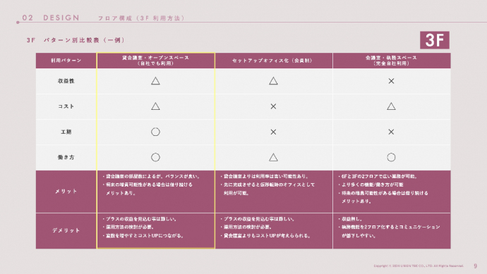 木暮 さきほどお話したとおり、最初は貸す案もあったくらいなので、貸会議室、セットアップオフィス、自社の執務スペースとパターンを提示して、それぞれの収益性や工事のコスト、メリット・デメリットなどをリスト化して検討材料にしていただきました。そのなかで、一番現実的なものに絞っていきました。
