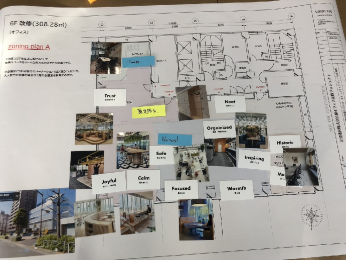 里山 そのあたりは、うちから提案した“ビジョナリーセッション”でイメージを膨らませていきましたよね。様々なデザインの写真を300枚くらいテーブルに並べて、プロジェクトチームの皆さんに「いいな」と思ったものをピックアップしていただき、個々がオフィスに求めているものを見つけ出していくという手法なのですが、ここでチームの皆さんのイメージが固まっていったような気がします。