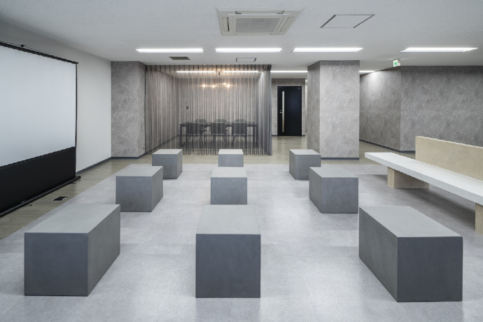 里山 その結果、6階をメインの執務スペースにして、3階には会議室を作るというパターンになりました。3階で働く人が出てきてしまうと、コミュニケーションが取りづらくなってしまいますからね。なので、会議室以外のフリースペースも設けているのですが、働くことを想定した作りにはしていません。御社の事業内容であるコンクリートをイメージした空間にしました。