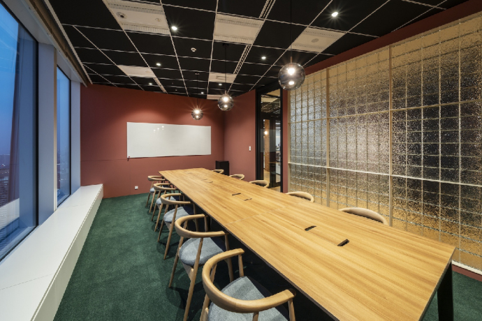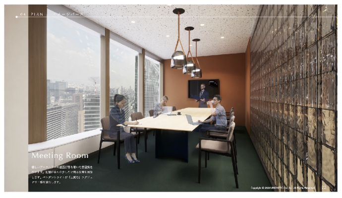 森 ありがとうございます。僕は、デザインをする前にこちらに足を運ぶことができなかったのですが、山本さんから動画や写真を見せていただいて、外光がすごく入る物件だなと思っていたんです。なので、窓から光がいっぱい入る場所に会議室を作り、窓の反対側をガラスブロックにして。会議室の外にも光が入るようにしました。また、ガラスブロックの向こう側にエントランスがあるので、来客に「39階だし、きっとすごい景色が待ち構えているだろう」と期待させるような効果もあると考えています。