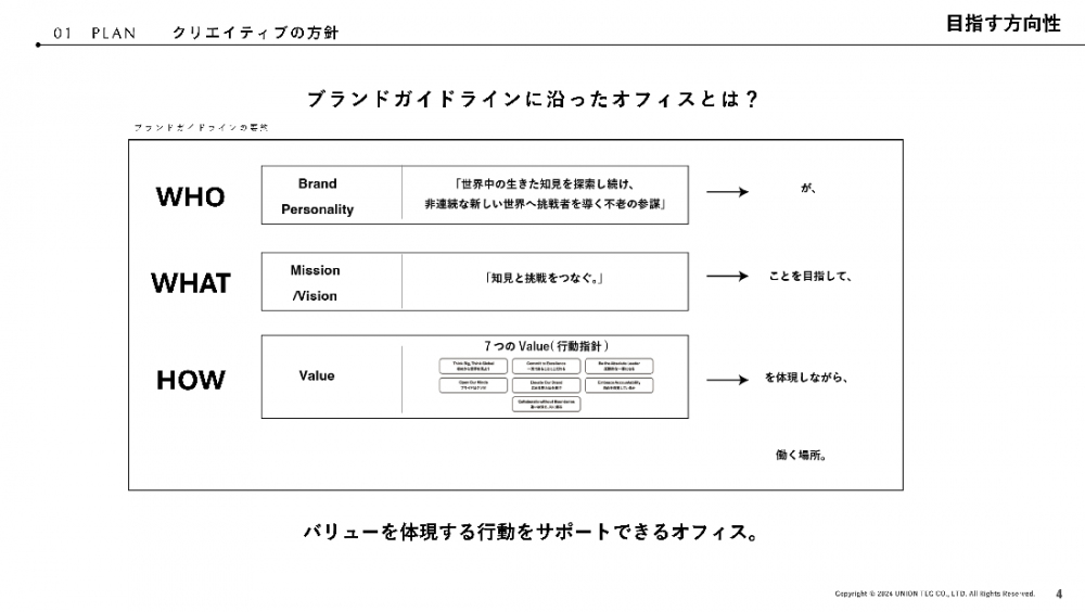 石村 村井さんが言っていた「執務とイベントを両方行なえるオフィスにしたい」という要望に加えて、2年前のリブランディングで新たに定めたブランドガイドラインをコンペ前に共有し、こちらに基づいたオフィスを作りたいというお話もさせていただいています。これにはビザスクというブランドを空間上でも表現し、オフィスに来る方々にカルチャーを体感してもらいたいという意図がありました。主な要望は、この2つです。