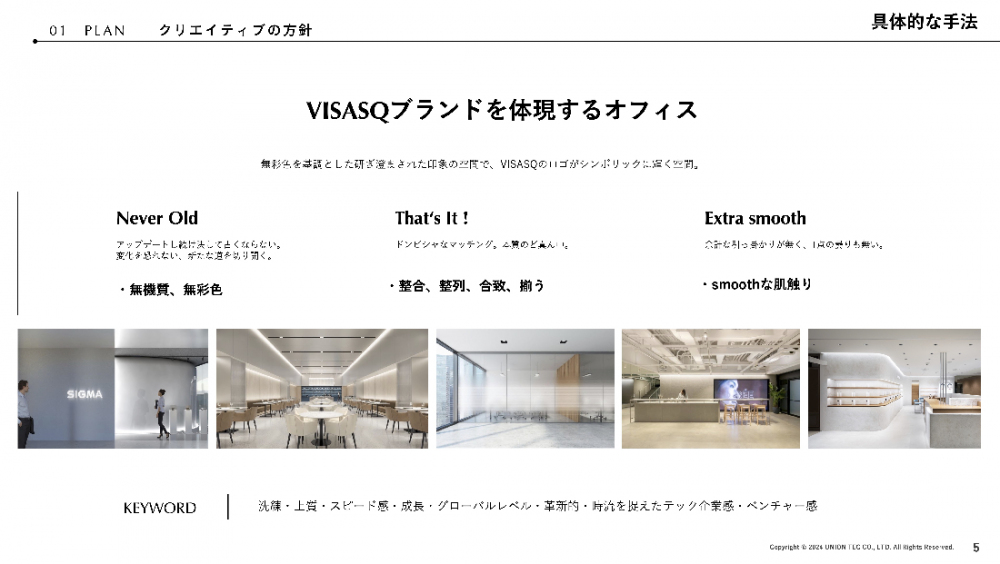 里山 そうですね。ビザスク様から共有していただいたブランドガイドラインの資料は70ページほどあり非常に詳しくまとめられていたので、デザインの方向性が定まりやすかったです。「オフィスの理想はここにある」と思えましたから。実際、「洗練」「上質」といったキーワードが抽出できたので、そのイメージに近い配色を提案しました。
