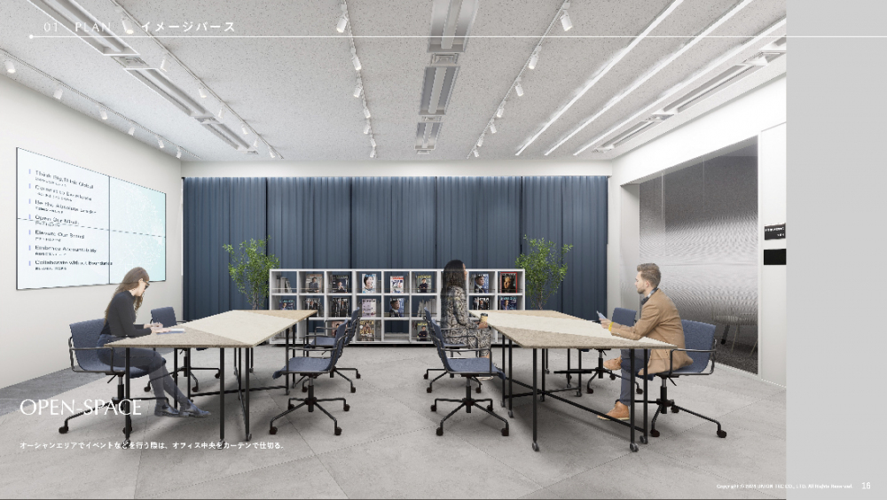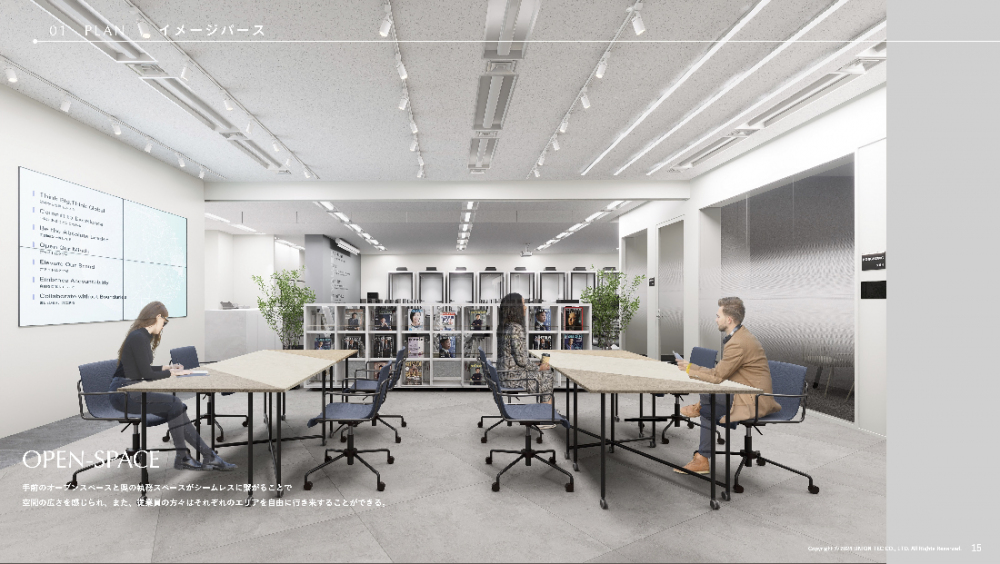 村井 プロジェクトを進めているうちに、会社が抱えている組織課題が変わっていったからですね。イベントスペースで開くイベントに関しても、最初は40〜50人規模で考えていたのですが、「社員全員が顔を合わせる会議を実施できる場所に」という役割を加えることになり、100人以上が集まれるようなスペースに変更していただきました。執務スペースとイベントスペースを仕切る位置に可動式の本棚を置き、イベントスペースにより多くの人が入れるように変更を加えていただくなどしています。
