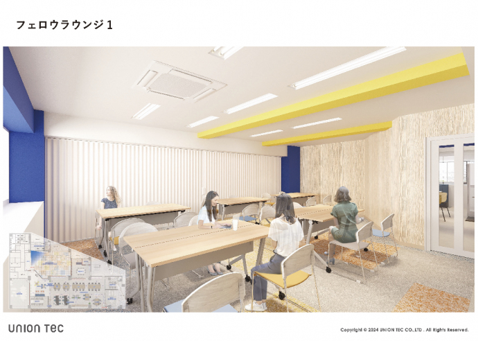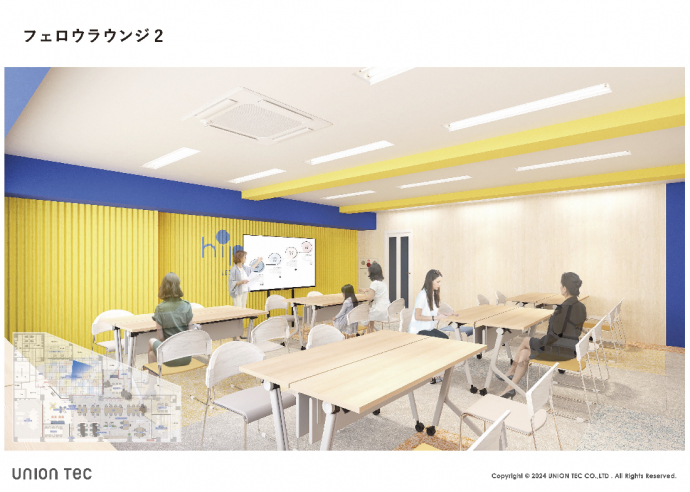 櫻田 少し裏話をすると、ヒッポファミリークラブ様との打ち合わせを終えたあと、大塚商会様、三和エフエムデザイン様のご担当者様と私で「薄々分かっていたけれど…各社強みが違いますよね」という話になりました。デザインはユニオンテック、家具は三和エフエムデザイン様、インフラは大塚商会様、というように。ならば、3社が手を取り合い、それぞれの強みを生かして今回の改装プロジェクトを進めるのはどうだろうという話になり、次のヒッポファミリークラブ様との打ち合わせで提案したところ、この形で進められることになりました。相当珍しいケースです。