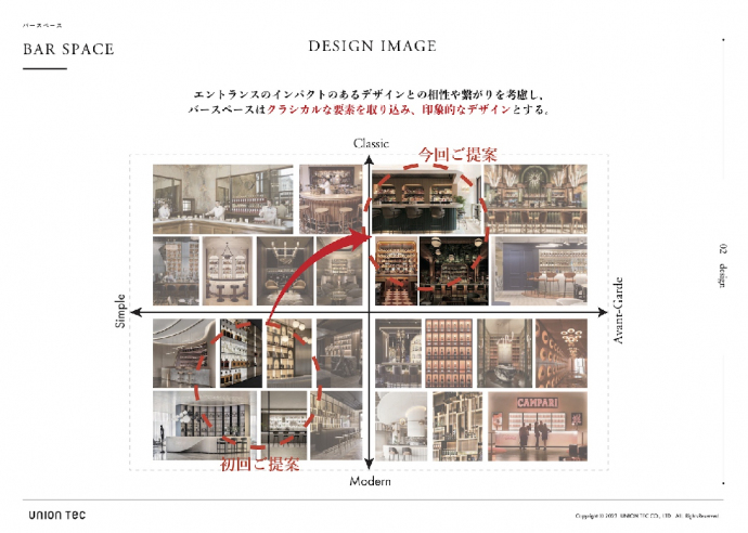 里山 そしてデザイナーとしては、デザインの方向性がブレないよう心がけました。今回はプロジェクトチームに6名いらっしゃって比較的多人数でしたので、こちらの提案が曖昧だったら意見が定まらず最後の最後まで決まらない可能性があります。そこで、エントランスは魅惑的、バーカウンターはオーセンティックというように、エリアごとにデザインテーマを定めて、一つひとつ承認をとりながら進めていく方法をとりました。そうすると、「椅子はこの色にしたい」「もっと明るい雰囲気にしたい」と細かな変更が出ても、デザインテーマの範囲内で変えていくことになるのでブレにくいですし、全員の意思統一もしやすいんですよね。