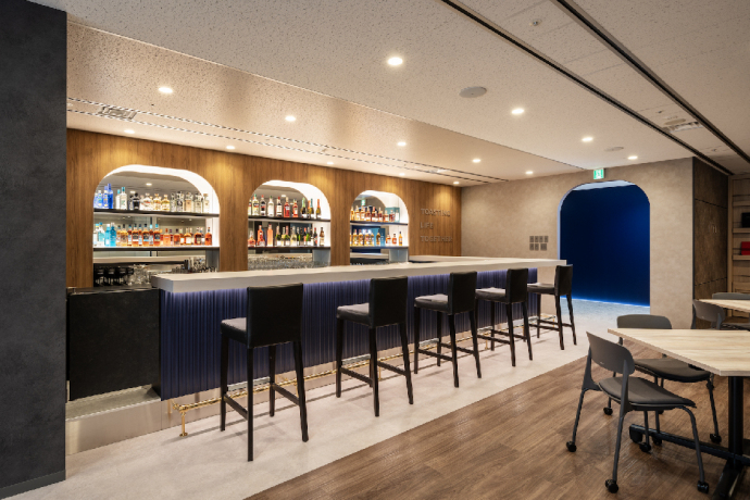佐治 ともあれ、あの青いエントランスを抜けるとすぐにバーカウンターとリフレッシュスペースなので、驚かれる方は多いと思います。空間のイメージがはっきりと変わるので。それぞれのエリアがまとまっていて綺麗です。