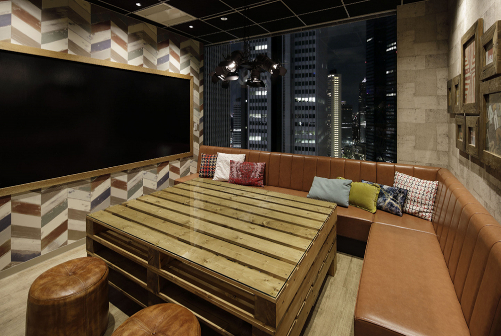 サンブロードバンド株式会社様のオフィスは、古材のWoodやブリックタイルなどヴィンテージな素材感をポイントに空間を構成し、オフィスらしい要素が極力排除されています。オフィスにいながら、カフェにいるような気分になれる空間です。