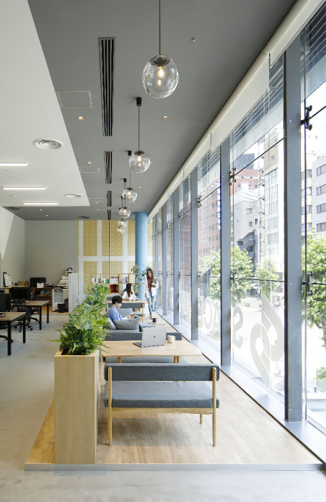 日光を効果的に取り入れ、空間の開放的な感覚を高めるガラスの採用。最近のトレンドとして、標準的な壁だけでなく、ガラスでの仕切りを採用するビジネススペースが増加しています。
