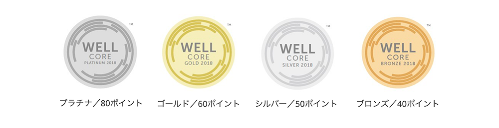 WELL認証において、4つのランクが設定されています:プラチナ、ゴールド、シルバー、そしてブロンズ。すべてのカテゴリの必須基準をクリアすると、加点基準の評価が開始され、その結果に基づき対応するランクが授与されます。