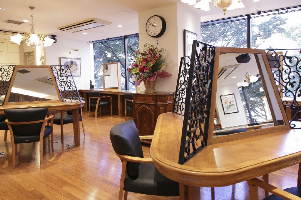 カットスペースは全面ガラス張り。陽の光が優しく注ぎ、緑々とした木が癒しの憩いの場を作り上げました。少しでもお客様が心安らぐよう、細かな気配りも忘れません。
