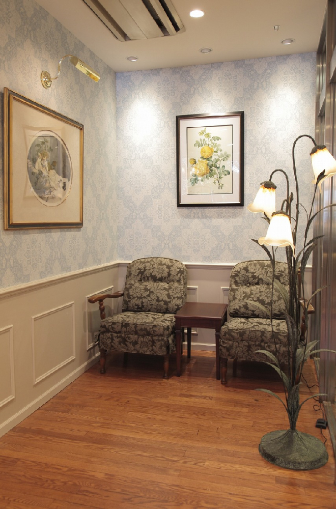 英国モダン調のウェイティングスペース。ウェイティングスペースは少し趣を変えてクラシカルな壁紙で仕上げ、前デザイン時のコンセプトである「英国モダン」の体現を強調しました。