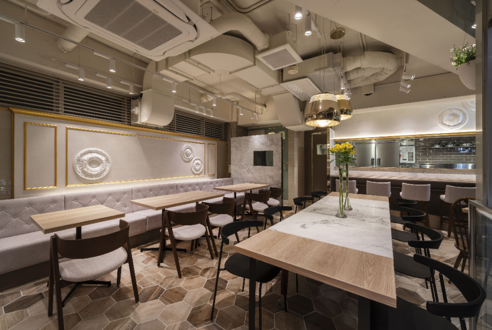 お客様は飲食店舗を初めて出店されるということで、場所的には閑静で狭小空間でありながらもフレンチシックなスタイルをベースに上品な雰囲気を出しながら、幅広い年齢層に受け入れられる空間を演出しました。
