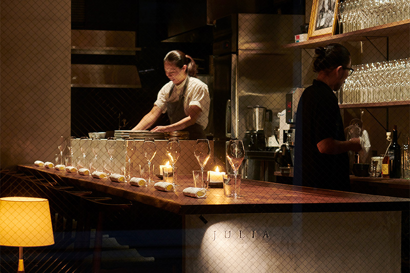 ゲストが横に並ぶバーのようなレイアウトにすることで、すべてのゲストに対し正面からのサービスができる。