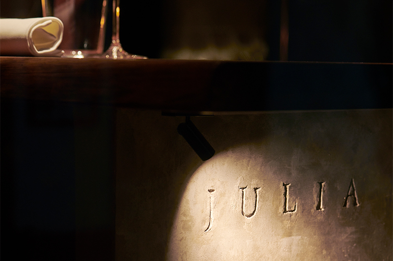 モルタルを彫り込んだ小さなサインは、主張しないことで隠れ家を演出する。