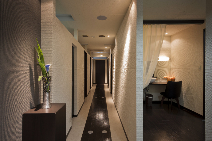 高級感のある綺麗な雰囲気は守りつつ、アットホームでくつろげる空間を意識したデザイン。広々としたエントランスは、白とダークブラウンのコントラストを利かせたモダンな空間。そこにグリーンをアクセントとしてレイアウトし、落ち着きと親しみやすさを演出しました。