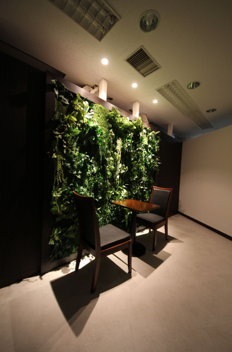 ポイントカラーとして生命感のある植物を使用することで、単なるアクセントカラーとしてだけでなく、爽やかな明るさをイメージしています。空間の場所によって調光を変化させることで、爽やかでもカジュアルになり過ぎない、絶妙なバランスになっています。