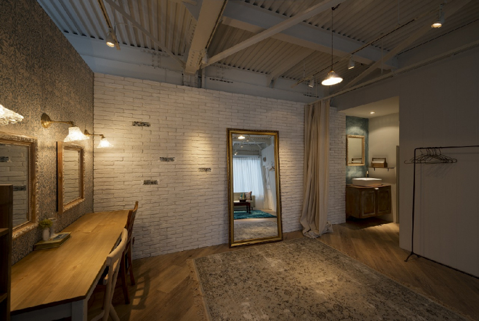 強いコンセプトを打ち出している撮影フロアよりも、ナチュラルなデザインにこだわったフィッティングスペース。ハンガーラックやミラーなどの什器のデザインテイストをしっかり揃えることで、スタジオ全体の世界観は崩さずに、機能的な要素を取り入れました。