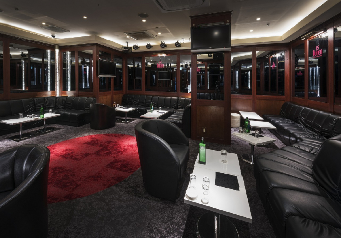 シックでありながら品のある黒のソファ、全体は控えめな色としつつ大きな赤い円がワンポイントとなっているフローリング。総合的に「落ち着いた大人の空間」を演出している店内となっています。