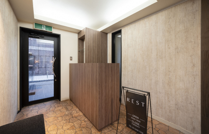 木は落ち着いた色味にし、ディスプレイの背面は石目調にすることで、柔らかい印象を残しつつ変化をもたらせました。ディスプレイの後ろにクローゼット設けることによって、機能面も充実したデザインにしました。