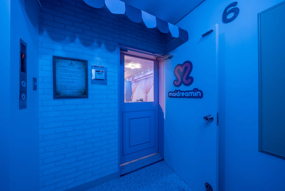 めいどりーみんらしさの詰まった夢の中のお家を思わせる可愛らしいエントランスは、これからメイドさんに会いに行ける期待感を高める空間。夜の時間帯は色の変化する照明を使用し、昼間とはまた違った高揚感を演出しています。