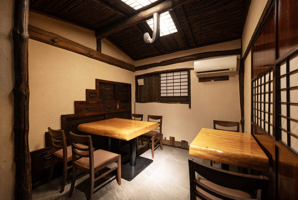古民家に元々あった6人用の掘りごたつテーブルの脚を付け替え、天板も2つに切断することでダイニングテーブルとして再利用しました。立派な無垢材の天板は迫力があり、趣があります。