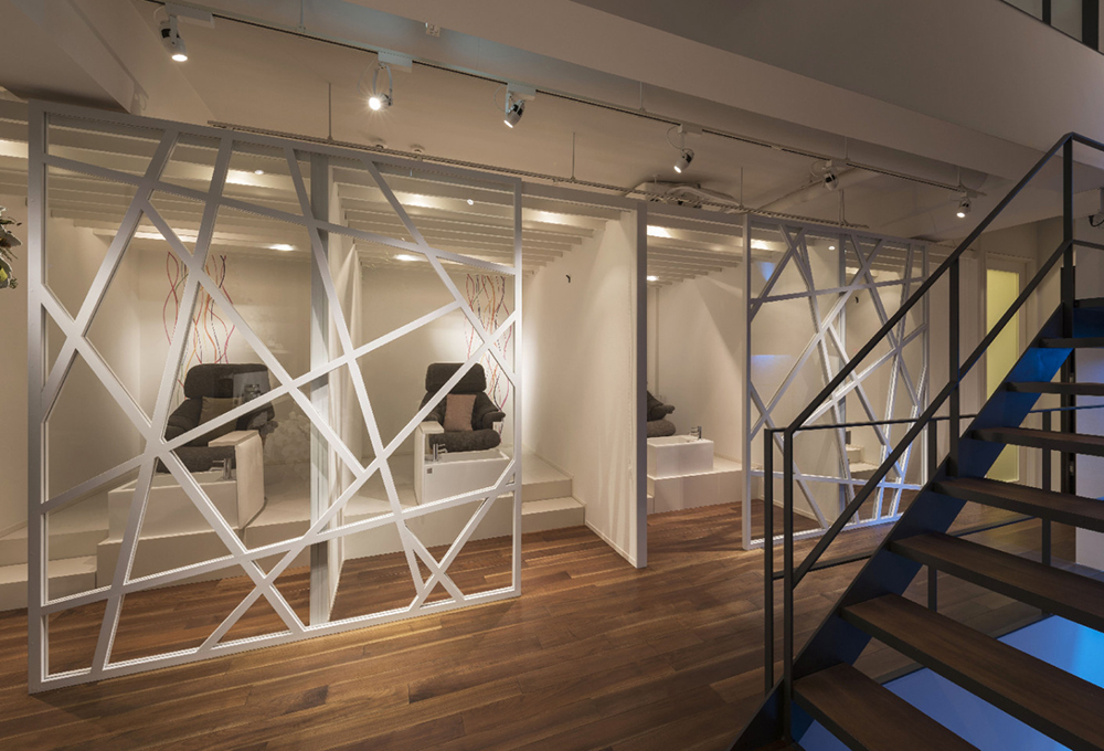 空間の特徴である、窓面からの採光を生かしたレイアウトで店内の明るさをポイントに。ブランドカラーをアクセントとし、モノトーンな空間にラグジュアリーさを付加しています。また、レセプションやネイル付近はしっかりと明るく保ち、個室は照度を落としてリラクゼーション効果を高めるようデザインしています。