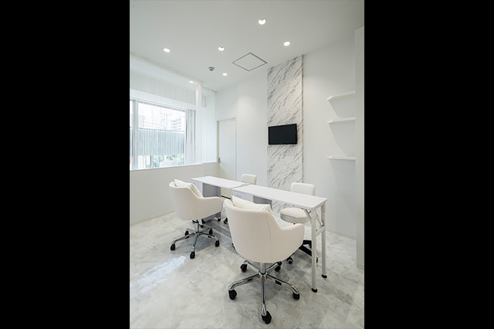オフホワイトの石目の壁には、ロゴサインを取り付けてフォトジェニックな空間に仕上げました。また、各ブースに異なる素材を取り入れながらもモノトーンで統一する事で、 ラグジュアリーな空間に。ネイルブースはストリングスカーテンで緩やかに仕切る事で、 柔らかい女性らしさを表現しています。